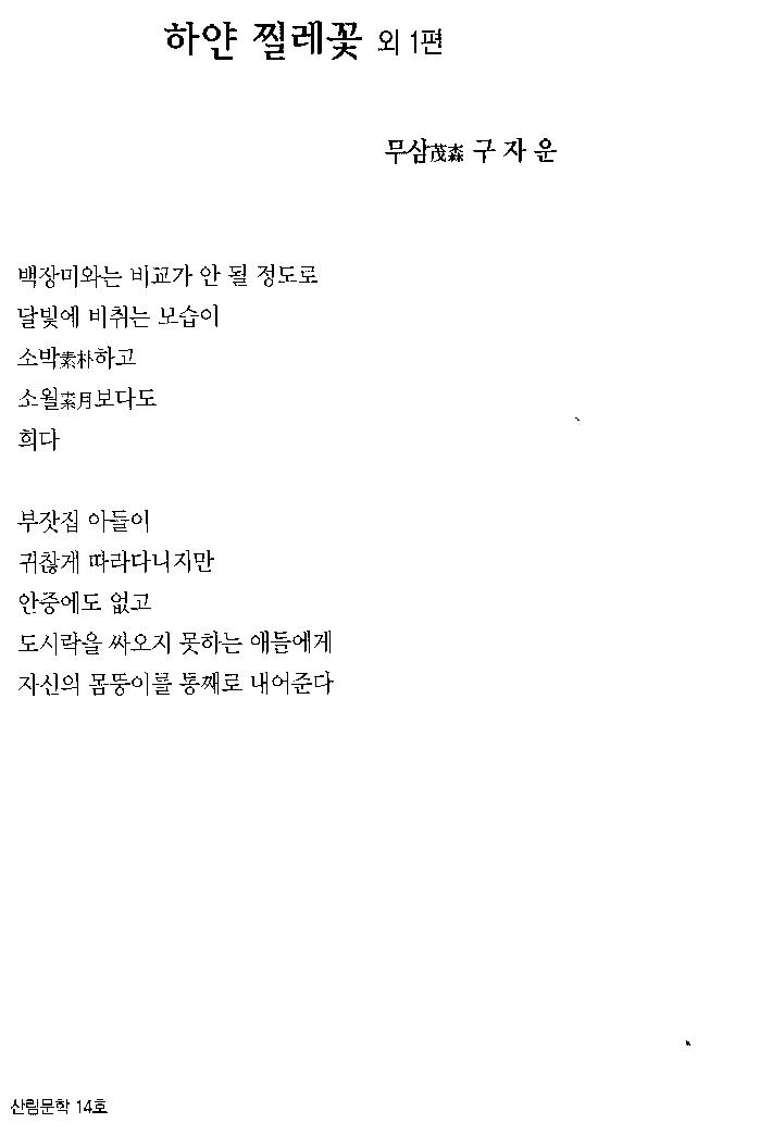 일러무삼 구자운의 시 '하얀 찔레꽃' '백일홍' 두 편이 산림문학14호에 게재됨
