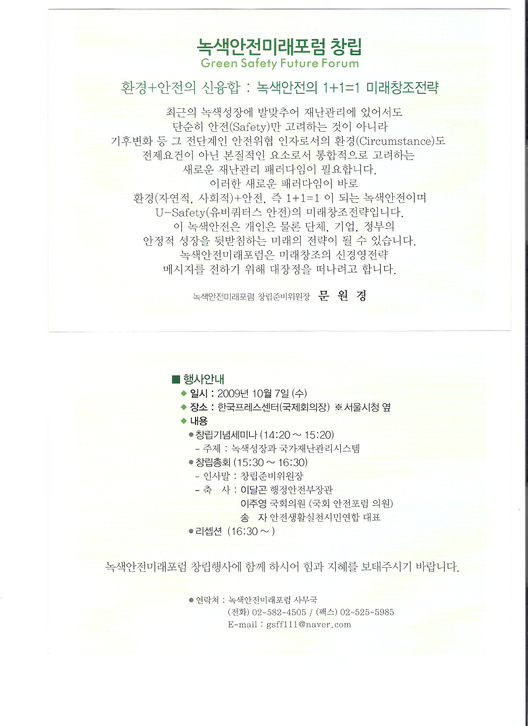 문원경동기의 녹색안전미래포럼 창립#많은 참석바랍니다