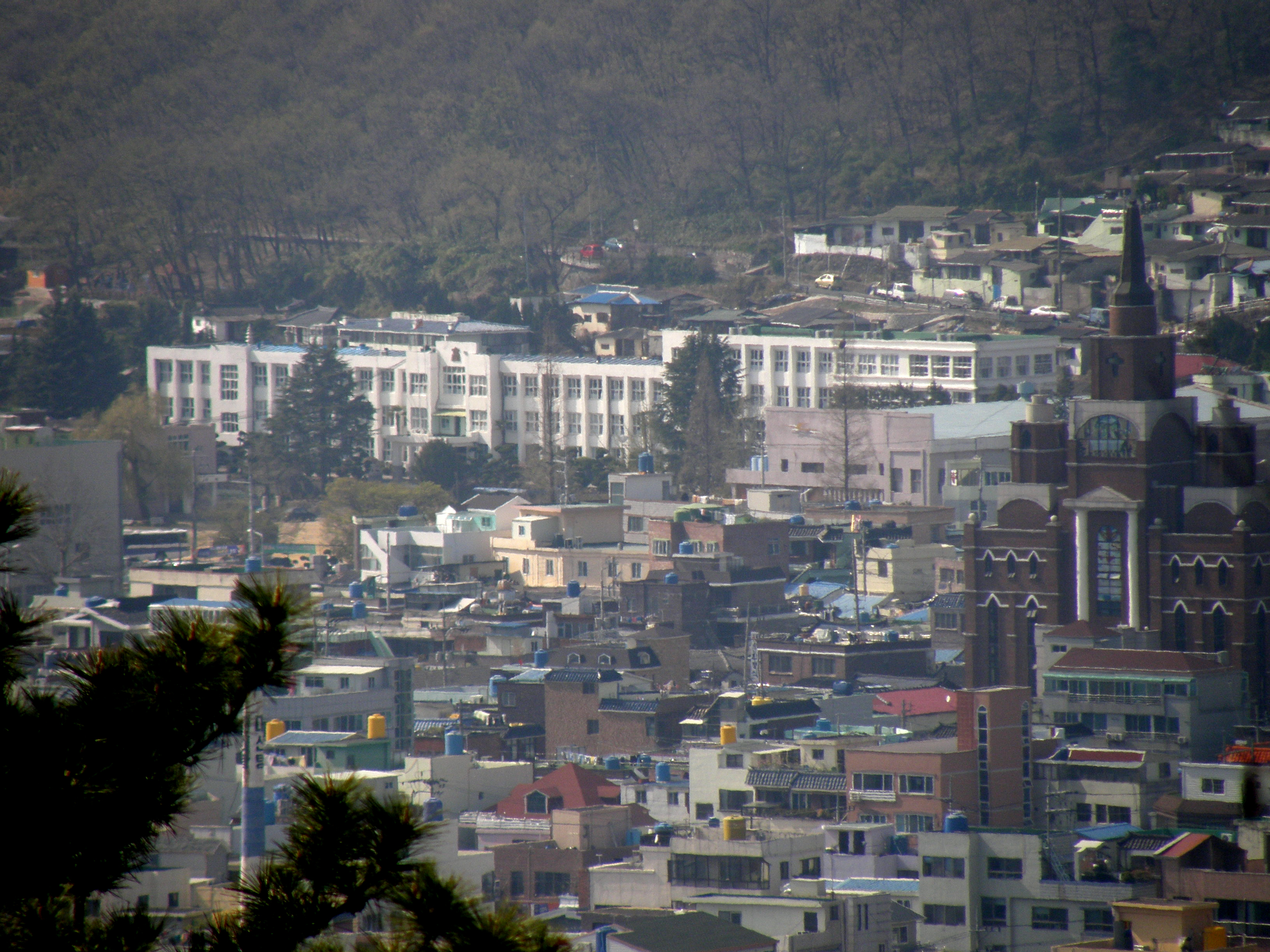 선학산에서 줌인한 모교와 촉석루