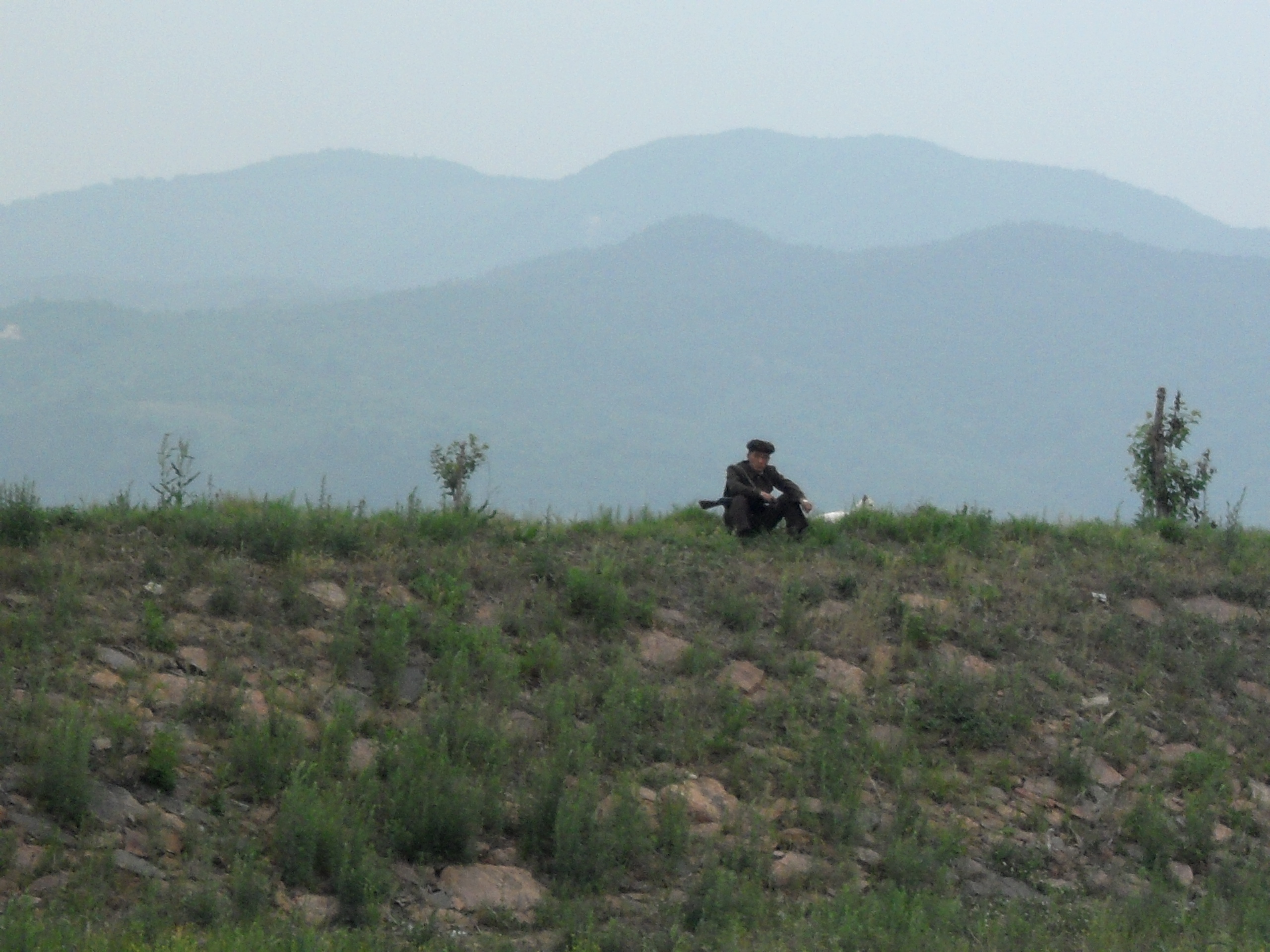 7: 강뚝에서 쉬고 있는 북한경비병