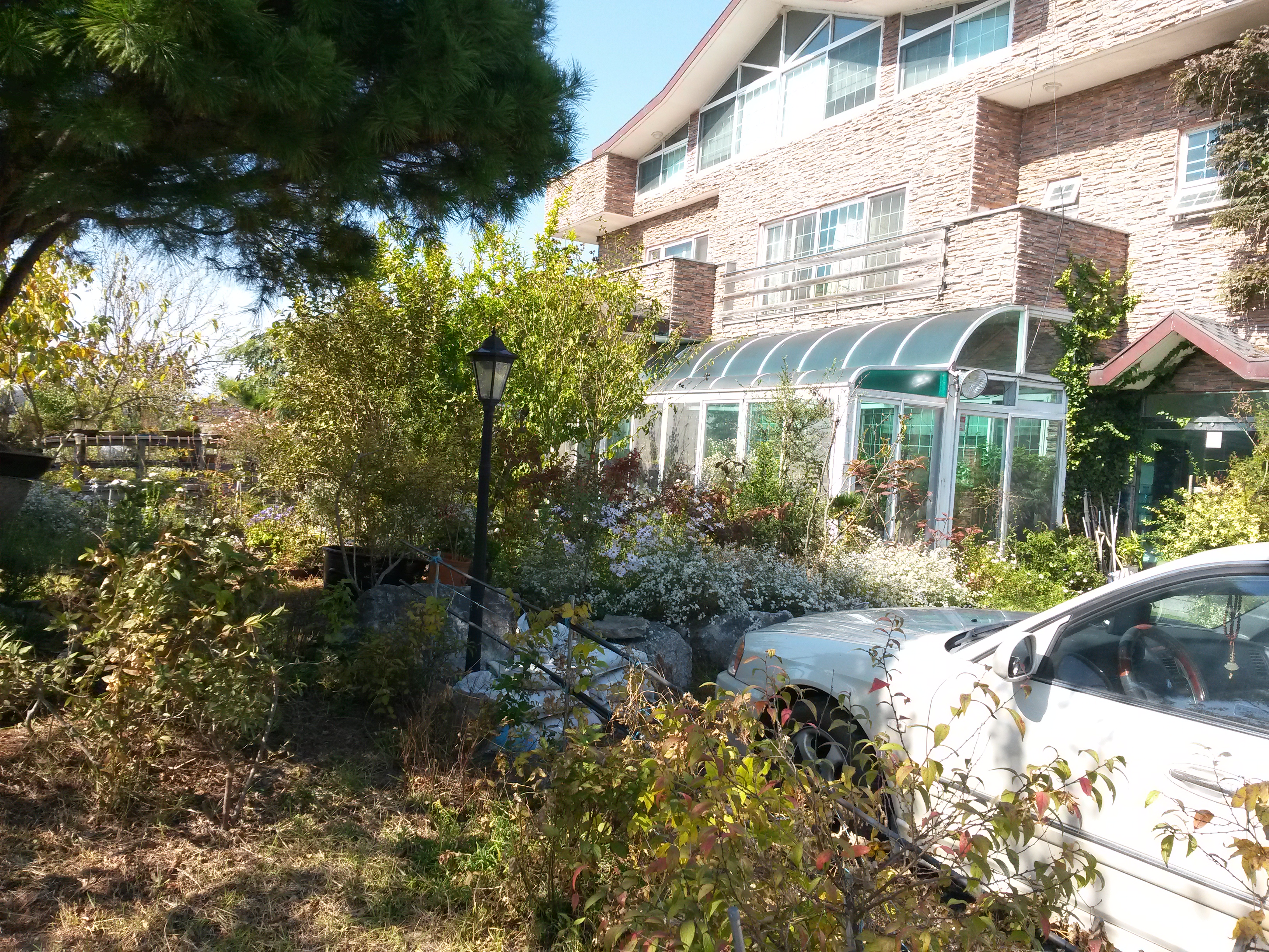 잘 꾸며논 정원에 떨어진 낙엽이 인사하고